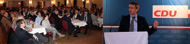 Das "Gespräch zum Neuen Jahr" mit Daniel Günther - Spitze! Eine Rede, die die wichtigen Themen ansprach und die "rüberkam". Danach viele persönliche Gespräche, für die er sich viel Zeit nahm. Rund 220 Gäste waren nach Schönberg in das "Hotel am Rathaus" gekommen, darunter viele Vertreter der Vereine und Verbände wie aus dem gesellschaftlichen Leben. Eingangs hatte Werner Kalinka bei der Begrüßung besonders den Schwung, das Profil und die klaren inhaltlichen Positionierungen Daniel Günthers hervorgehoben. Er habe - und das schon nach kurzer Zeit - "eine Portion guter politischer Würze" in die schleswig-holsteinische Politik gebracht. Deutlich skizzierte der Landes- und Fraktionsvorsitzende unter häufigem Beifall seine Positionen: Die politische Rückendeckung für die Polizei ("Wir stehen hinter der Polizei") und eine Überprüfung der von der Landesregierung veranlassten Schließung der Polizeistationen, hierbei nannte er ausdrücklich den Kreis Plön. Wichtig sei in der Sicherheitspolitik ein konsequentes Vorgehen gegen Täter. Keine neue Strukturdebatten in der Bildungspolitik, wichtig seien hingegen die Umsetzung der Lehrpläne und eine gute Unterrichtsversorgung, so eine Kernbotschaft zur Bildungspolitik. Er sprach sich dafür aus, wieder Schulartenempfehlungen zu geben: "Die Eltern brauchen klare Vorgaben, damit sie wissen, wo ihre Kinder stehen." Die Hochschulpolitik gehöre nicht wie derzeit bei der Landesregierung zum Sozialministerium, sondern "in ein richtiges Ministerium." Die Landesregierung habe in den fast fünf Jahren ihrer Amtszeit rund 2,5 Mrd. Euro mehr Steuern bekommen, gebe das Geld zum Teil aber an den falschen Stellen aus. Es werde zu wenig investiert, besonders zu wenig in Infrastruktur. Daniel Günther kündigte Änderungen beim Thema KiTa an: Die Kommunen müssten finanziell mehr unterstützt werden. Besonders hob er - sehr zur Freude des Vorsitzenden des Kreisbauernverbandes, Heiner Staggen - auch den ländlichen Raum und die Landwirtschaft hervor: "Bei uns bekommt die Landwirtschaft wieder Unterstützung." Der ländliche Raum sei von hoher Wichtigkeit für die Wirtschaft. |
